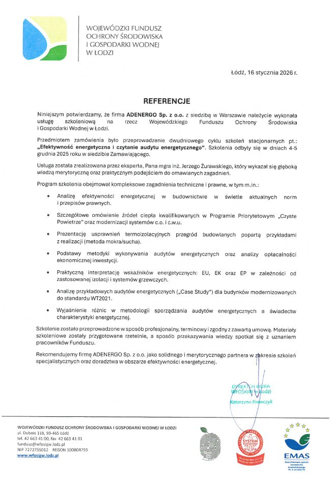 Referencje od WFOŚiGW w Łodzi są dla nas kolejnym dowodem na to, że Adenergo to solidny partner w zakresie szkoleń specjalistycznych i doradztwa.
